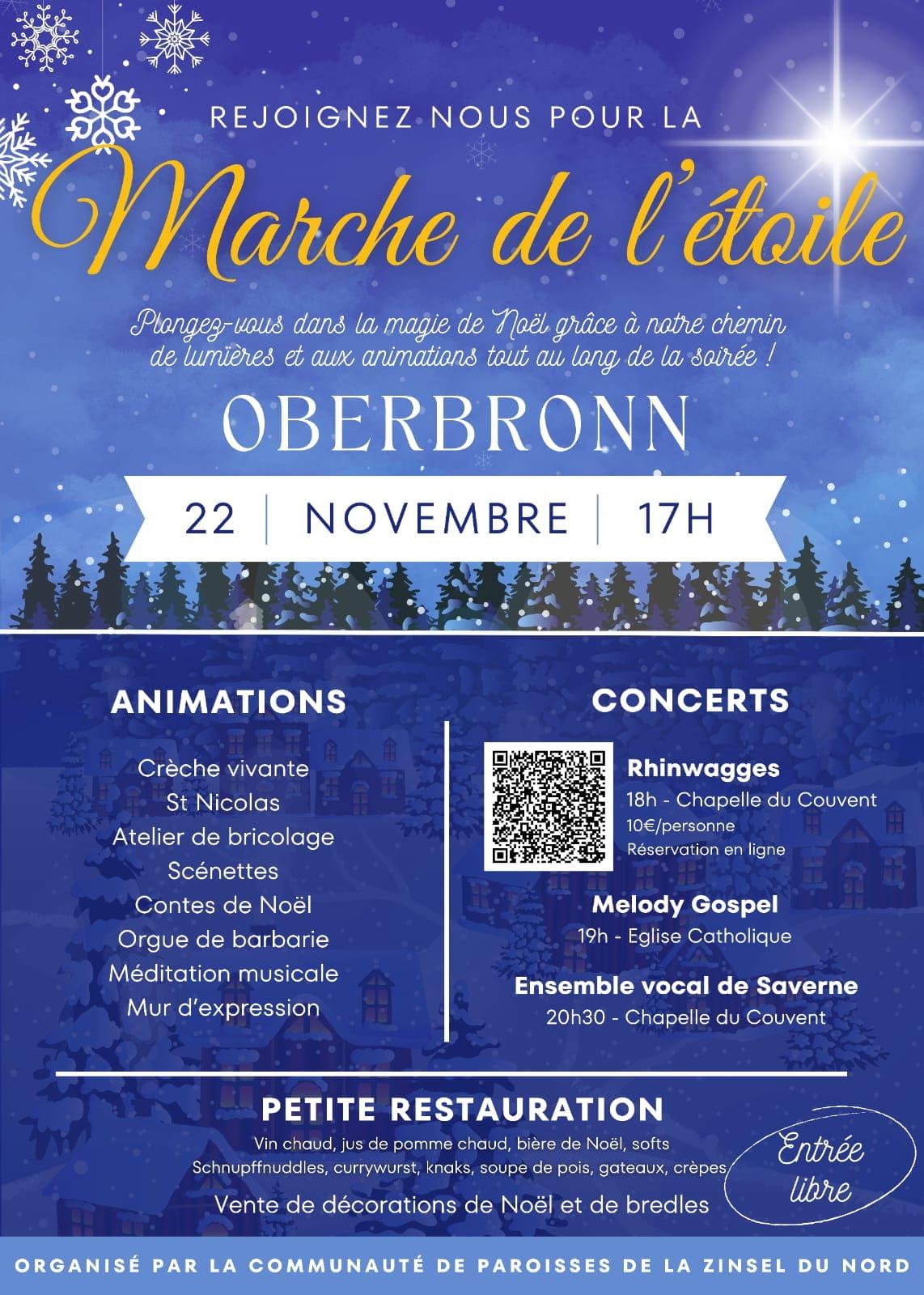 Vivez une soirée féérique à Oberbronn : Marche de l’Étoile le 22 novembre, chemin illuminé, crèche vivante, contes, musique, vin chaud et concerts. Entrée libre.