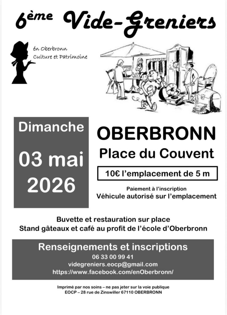 Le 6ème vide-greniers d’Oberbronn aura lieu le 3 mai 2026 Place du Couvent. Buvette, restauration et stands au profit de l’école.